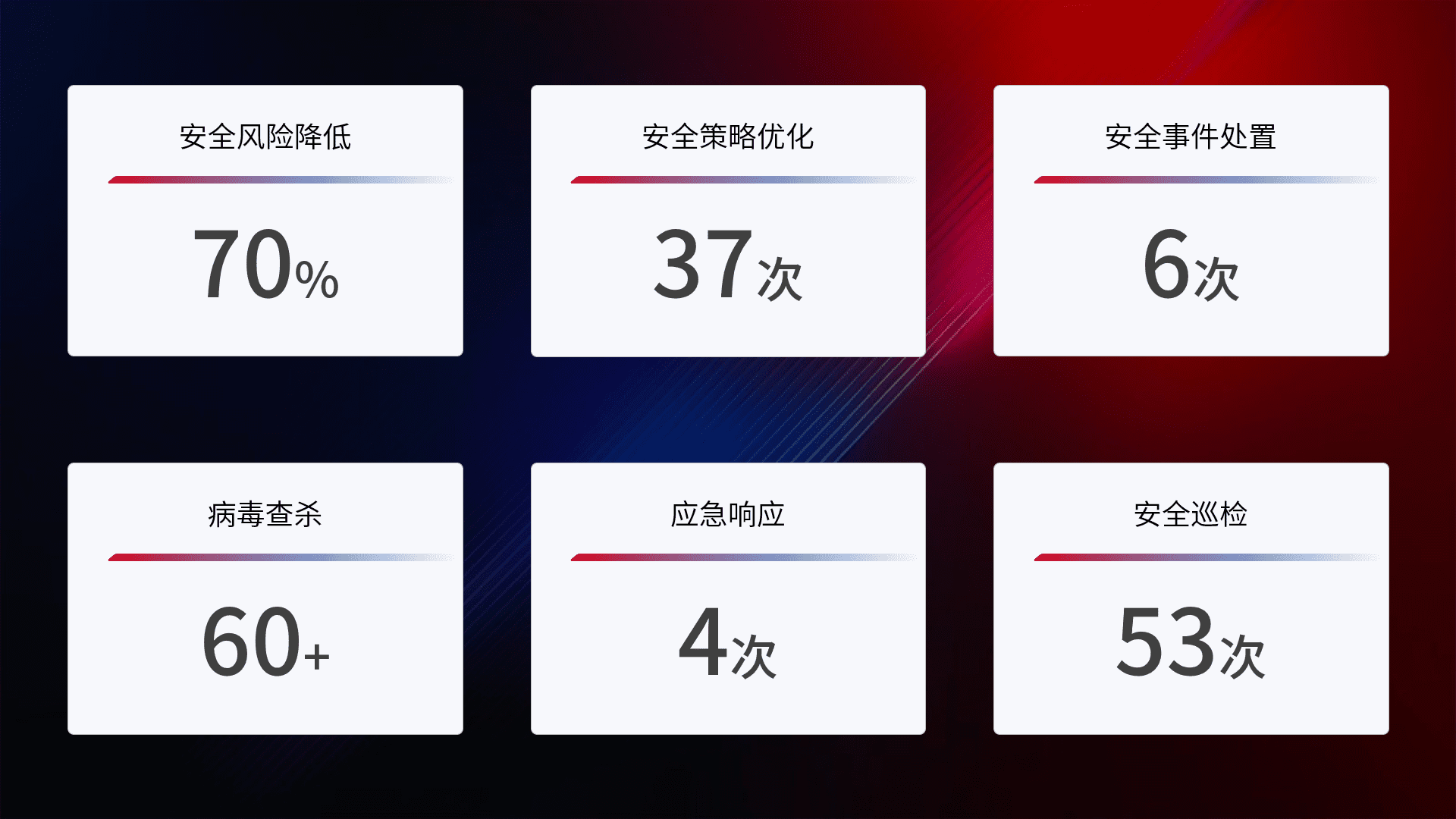 提供全面的安全事件报告体系,,,,包括处置报告、、、、周报、、季度和年度总结,,,结合持续监控,,,,帮助客户深入了解网络安全状况。。。。