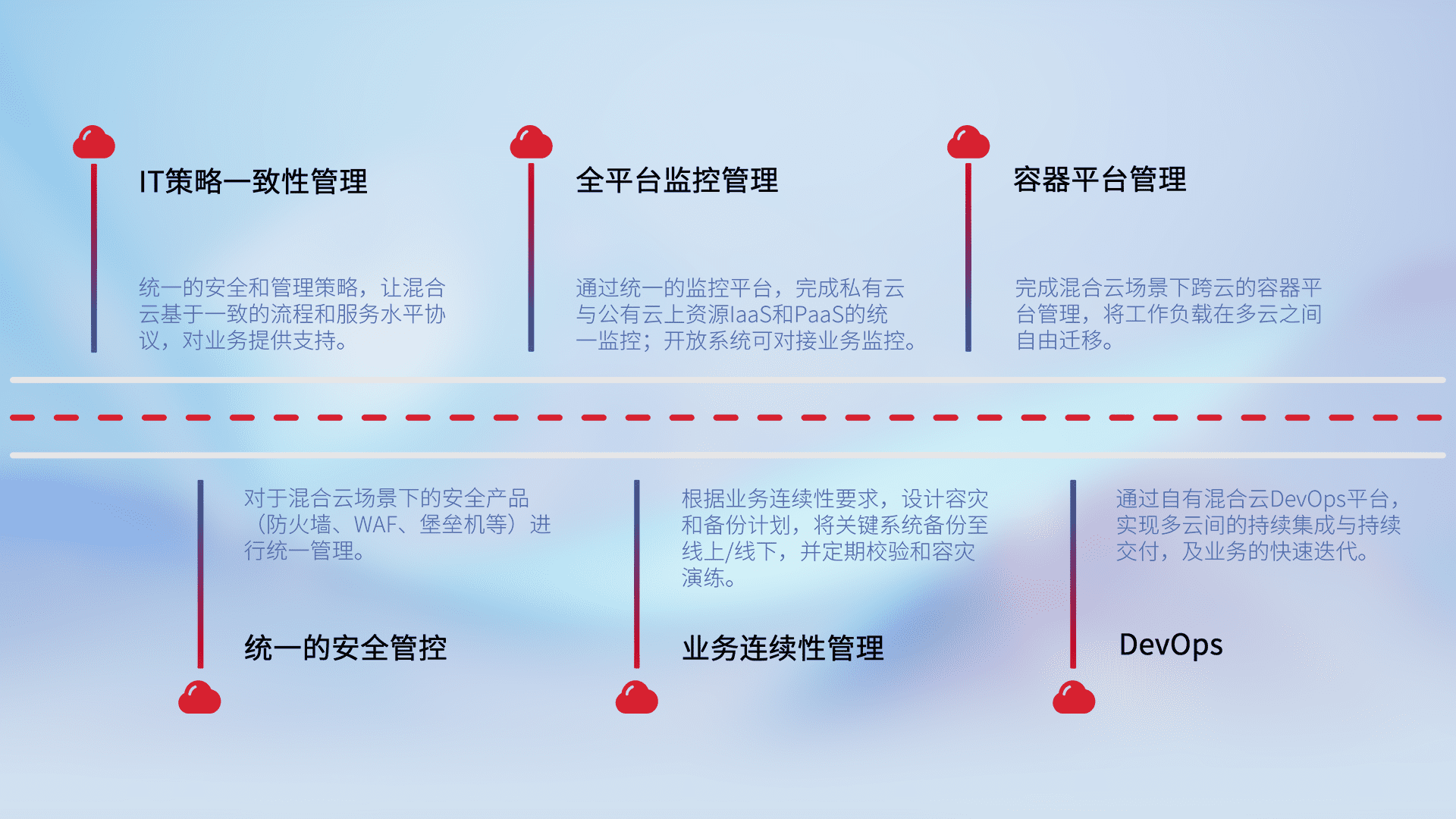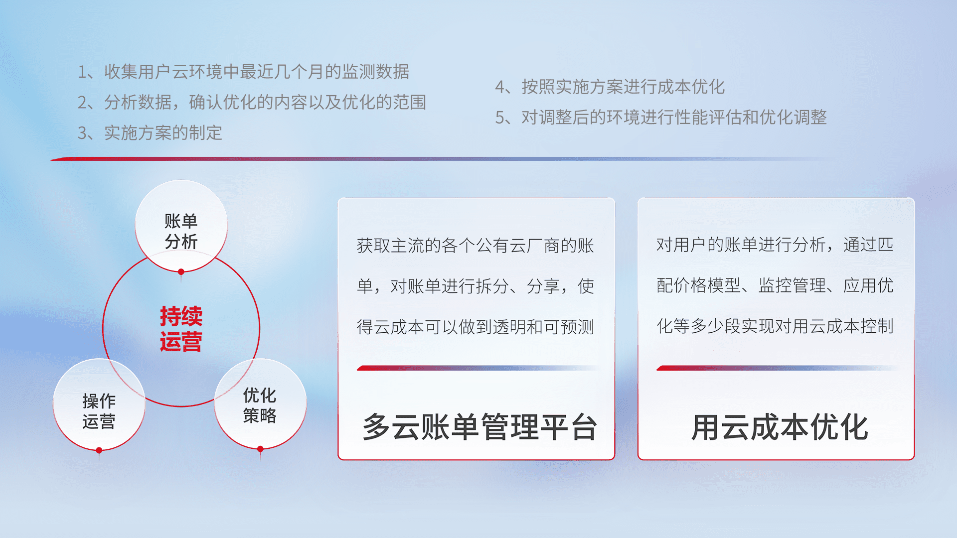 通过多云纳管,,,,以统一的资源数据模型把客户的云资源进行抽象和封装,,,进而实现对多云资源的统一操作,,,保障云资源管理的可靠性、、稳定性与可用性。。。。量身定制化运维内容,,,,配置、、开发运维、、、补丁管理、、备份、、、、监控、、认证和访问管理、、审计和日常巡检等,,,保障在用云过程中的可靠度,,稳定度以及高可用率。。。